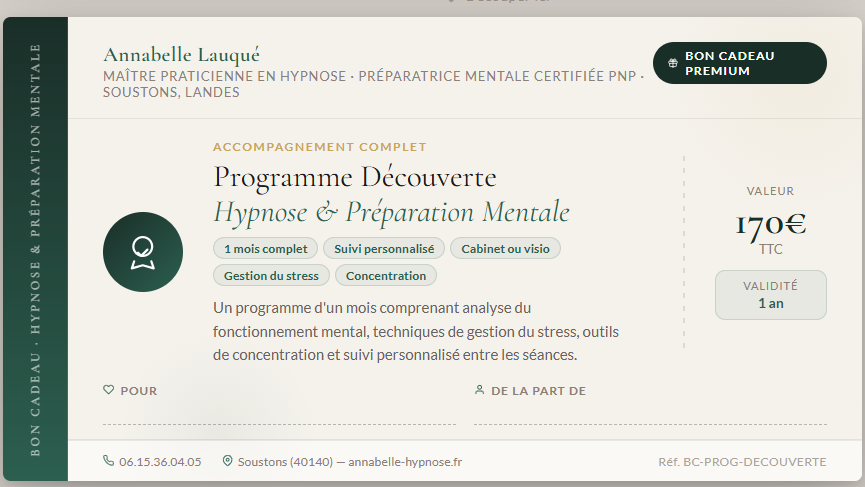 Ce bon cadeau permet d’offrir le Programme Découverte complet — un accompagnement d’un mois en hypnose et préparation mentale avec Annabelle Lauqué, Maître Praticienne en Hypnose et Préparatrice Mentale certifiée PNP, à Soustons dans les Landes.