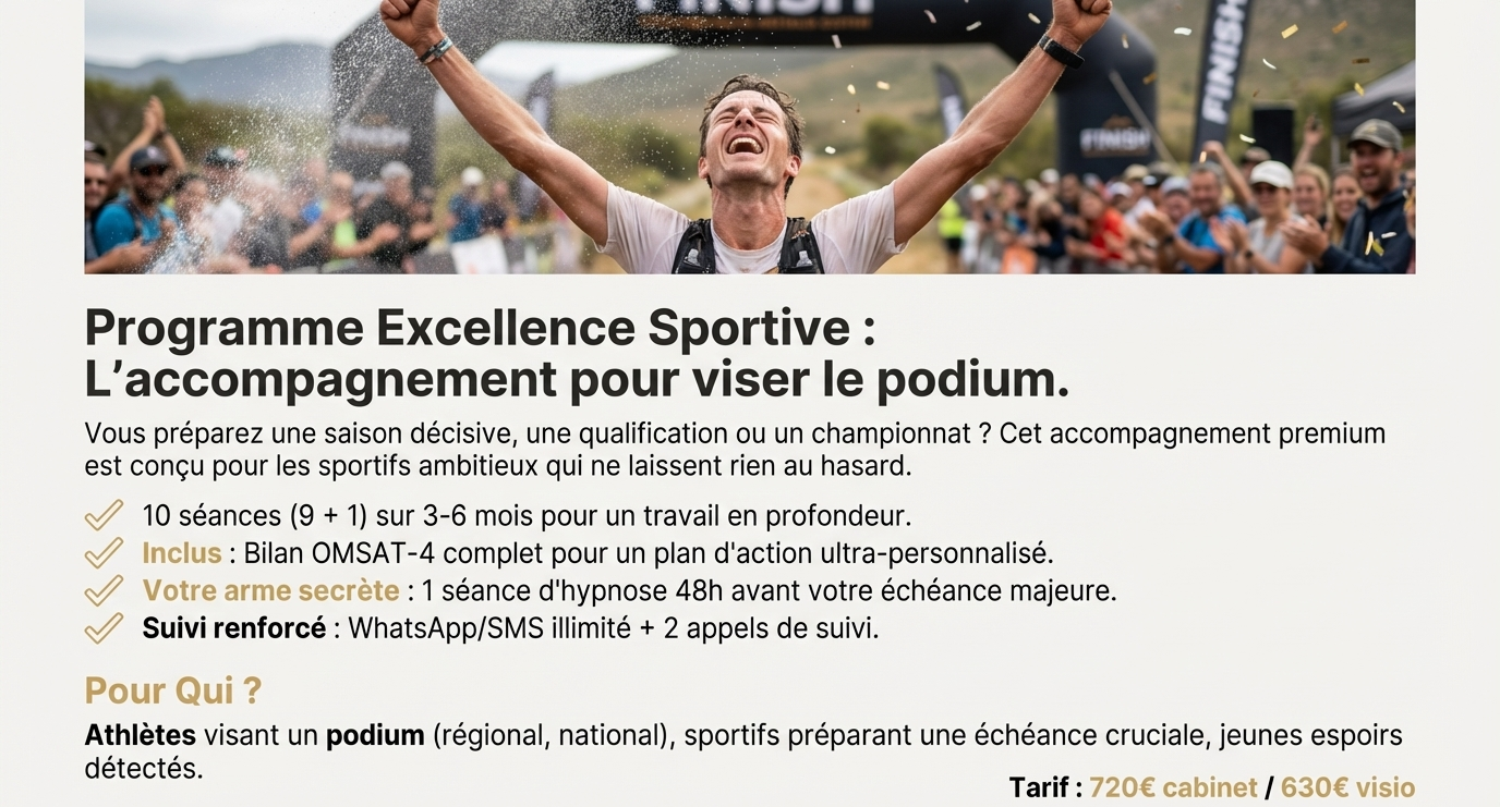 Vous visez le podium et cherchez un accompagnement premium ? Ce programme complet inclut un bilan scientifique OMSAT-4 pour identifier précisément vos points forts et axes d’amélioration. La grande force de ce programme : une séance stratégique 48h avant votre échéance majeure pour vous mettre dans les meilleures dispositions mentales. Avec 10 séances et un suivi renforcé, c’est l’investissement idéal pour vos objectifs ambitieux.